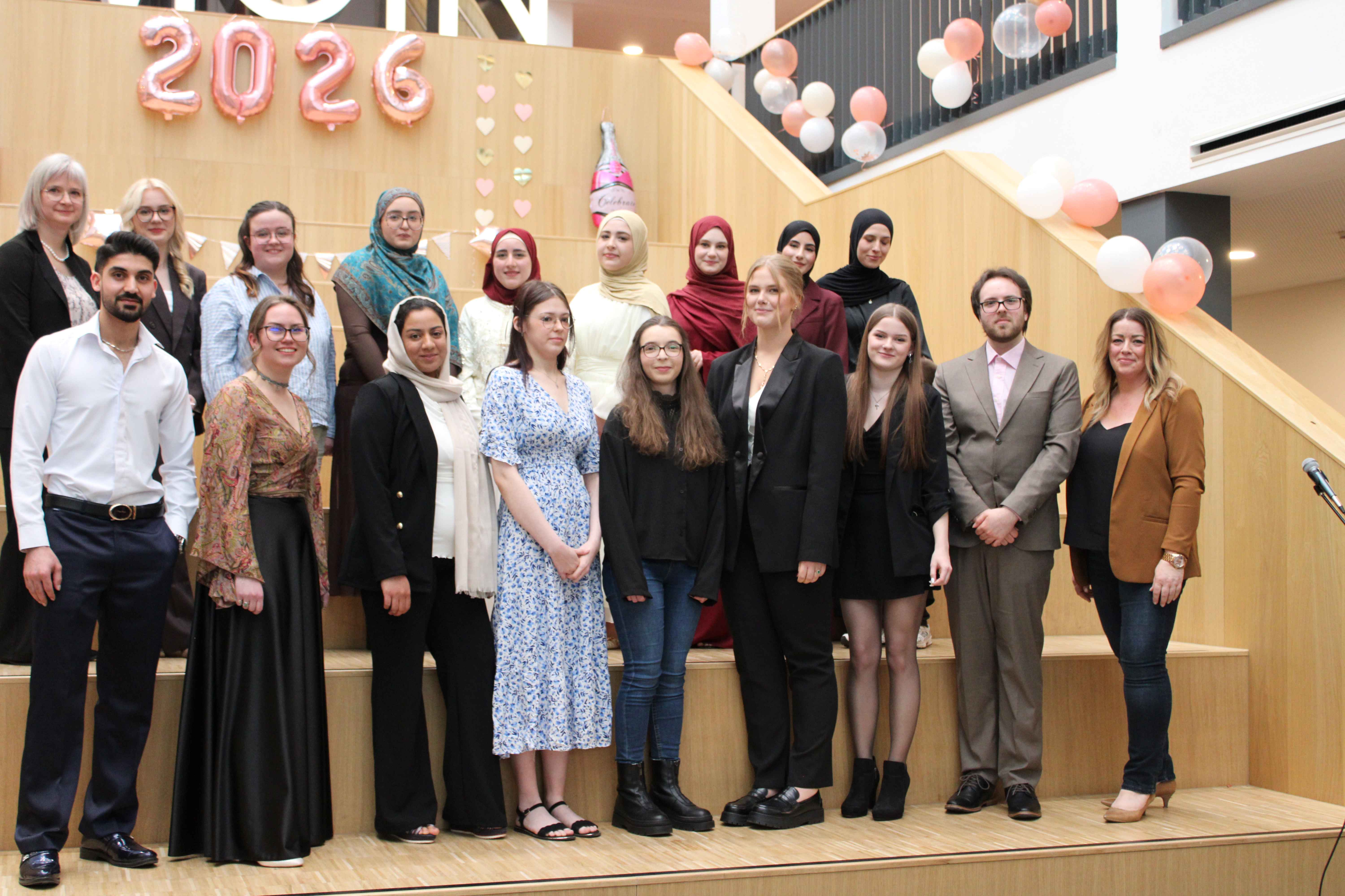 Die Absolventinnen Elin Lietz und Farah Thini dankten Freund*innen, Familien und Lehrkräften – besonders Klassenlehrerin Frau Guldan, die stets an sie geglaubt habe. Frau Guldan zog ein Fazit der letzten zweieinhalb Jahre: Die 17 hätten die „Rezeptur kompetente PTA“ gefunden – mit Fantasie, Fachwissen, Durchhaltevermögen, etwas Nervosität, Humor und viel Teamgeist. Gemeinsam mit Frau Cordes überreichte sie die Zeugnisse.