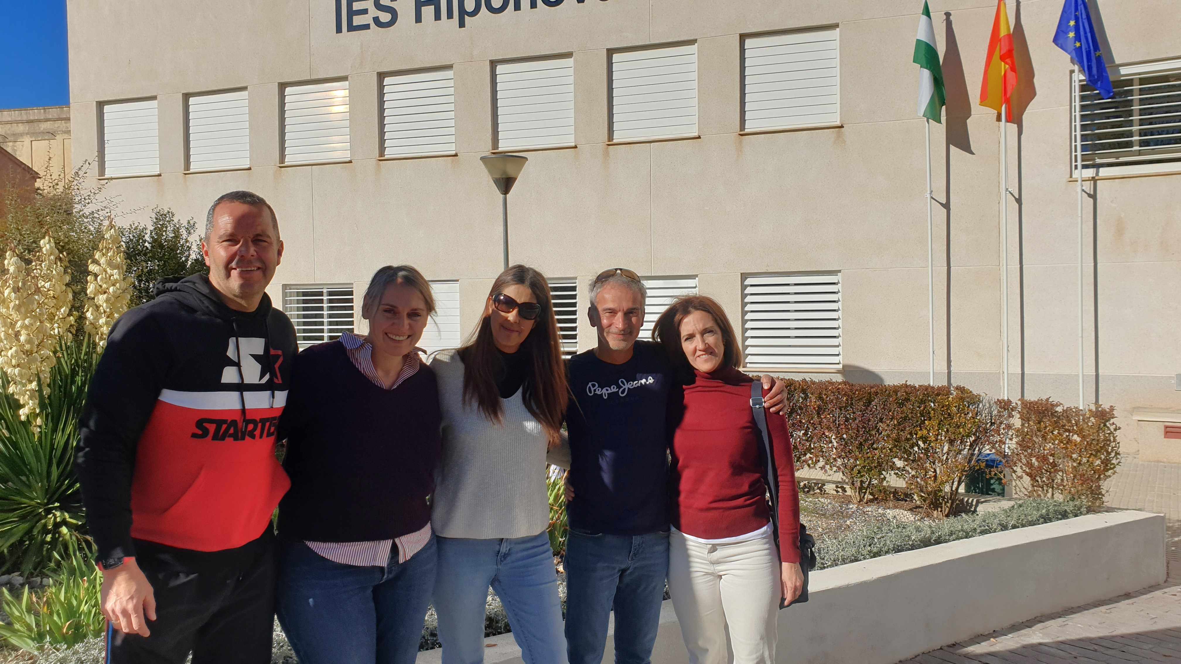 Lehrkräfte Dorothee Lux (2. von links) und Andreas Rink (2. von rechts) vor der spanischen Partnerschule in Montefrío.