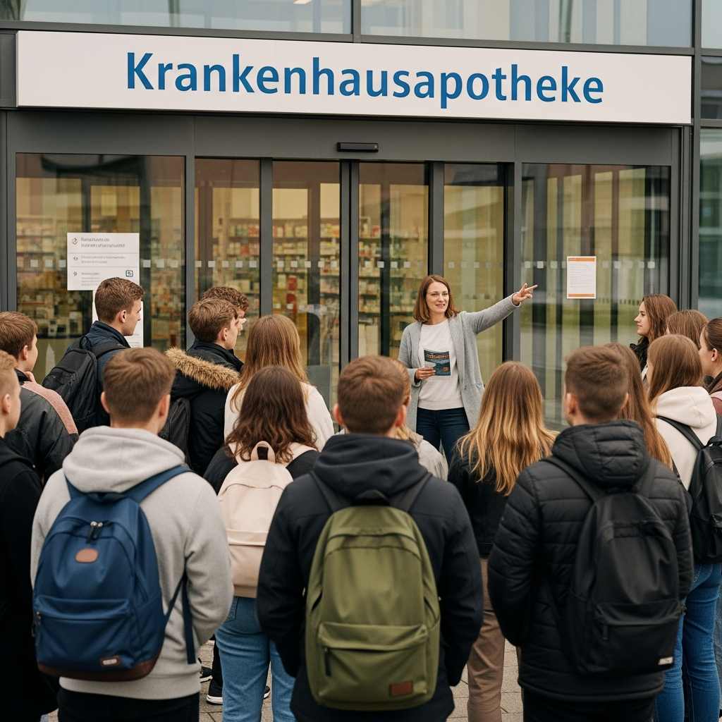 Den Auftakt bildete der Besuch der Krankenhausapotheke der Elbe Kliniken in Stade. Nach einer freundlichen Begrüßung erhielten die Schüler*innen einen anschaulichen Vortrag über Aufgaben, zentrale Rolle in der sicheren Arzneimittelversorgung, logistische Abläufe und die interprofessionelle Zusammenarbeit. Thematisiert wurden zudem aktuelle Herausforderungen und der geplante Neubau mit modernem Unit-Dose-System für mehr Sicherheit und Effizienz – die Vorfreude des Teams war spürbar.